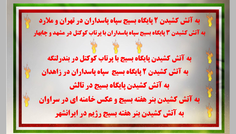 • به آتش کشیدن ۳پایگاه بسیج سپاه پاسداران با پرتاب کوکتل در مشهد و چابهار