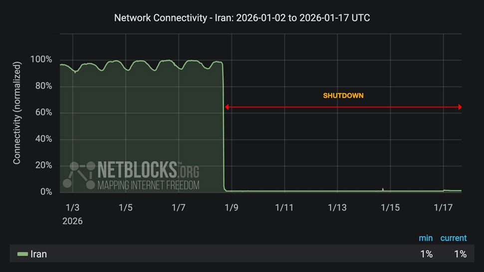 «نتبلاکس»، نهاد ناظر بر وضعیت ترافیک اینترنت، روز یکشنبه ۲۸ دی اعلام کرد که با وجود یک افزایش کوتاهمدت و محدود در دسترسی کاربران ایرانی در ساعات ابتدایی روز، اتصال اینترنت در ایران همچنان در وضعیت «تقریباً صفر» باقی مانده است.