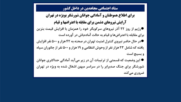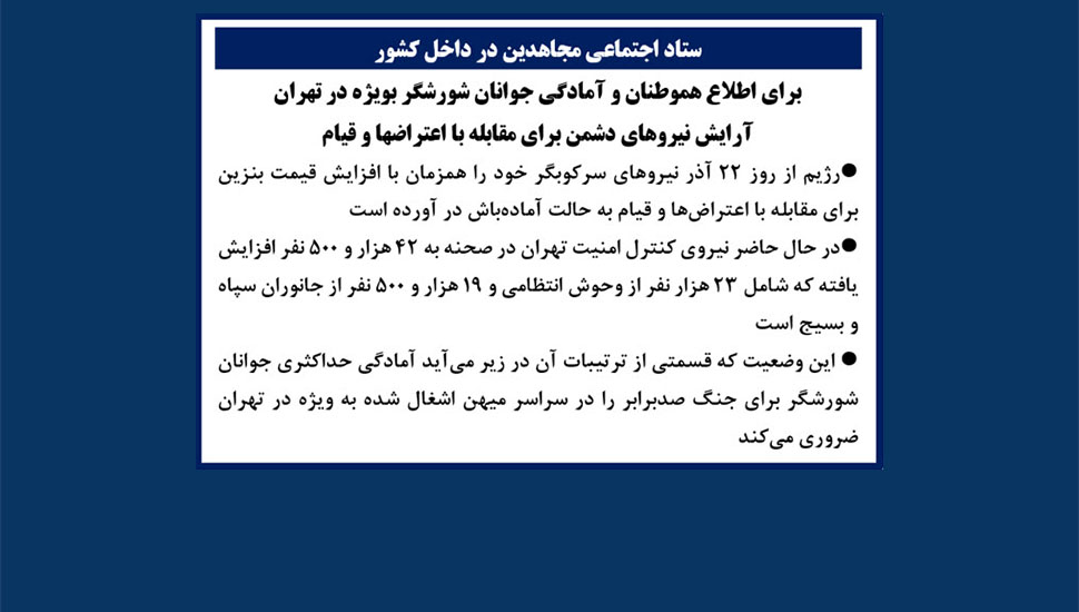 رژیم از روز ۲۲ آذر نیروهای سرکوبگر خود را همزمان با افزایش قیمت بنزین برای مقابله با اعتراضها و قیام به‌حالت آماده‌باش در آورده است. این وضعیت که قسمتی از ترتیبات آن در زیر می‌آید آمادگی حداکثری جوانان شورشگر برای جنگ صد برابر را در سراسر میهن اشغال شده به‌ویژه در تهران ضروری می‌کند.