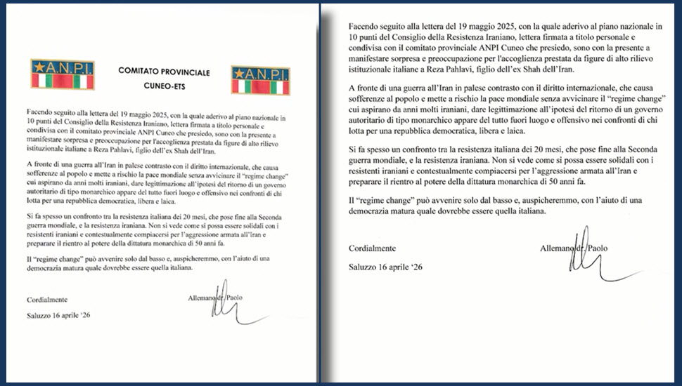 انجمن پارتیزانهای مقاومت ضدفاشیستی ایتالیا در شهر کونئو طی بیانیهیی اعلام کرد: ما بدین وسیله شگفتی و نگرانی خود را نسبت به حضور رضا پهلوی فرزند شاه سابق ایران در ایتالیا ابراز میکنیم.