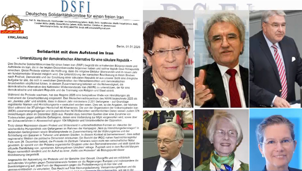کمیته آلمانی همبستگی برای ایران آزاد از قیامهای مردمی در ایران که روز ابعاد تازهیی میگیرد، استقبال میکند. این اعتراضات، در کنار پایداری مردم ایران در برابر سرکوب، امید به پایان دیکتاتوری مذهبی و تغییر بنیادین در سال جدید را افزایش داده است. از نگاه ما، حمایت از این قیامها واز خواست مردم ایران برای استقرار یک جمهوری دموکراتیک و جدایی دین از دولت، وظیفهای فوری برای هر فرد و نهاد پایبند به ارزشهای دموکراتیک در اروپا است. در همین چارچوب، ما بر ضرورت حمایت از آلترناتیو دموکراتیک شورای ملی مقاومت ایران تأکید میکنیم؛ آلترناتیوی که برای تحقق یک ایران آزاد، دموکراتیک و مبتنی بر جدایی دین و دولت مبارزه میکند.