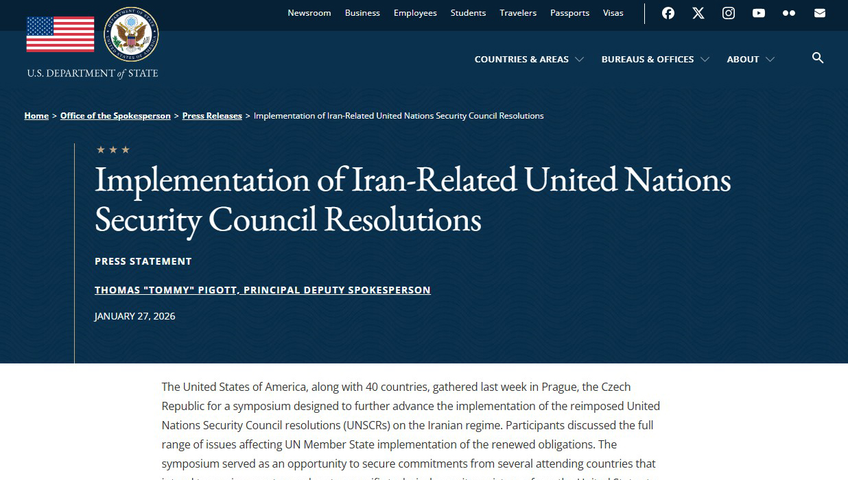 بیش از ۴۰کشور جهان در جلسهیی در پراگ پایتخت چک، در پاسخ به تهدیدهای رژیم ایران و سرکوب وحشیانه معترضان ایرانی بر اجرای کامل تحریمهای بینالمللی علیه این رژیم تأکید کردند. وزارت امور خارجه آمریکا اعلام کرد: «آمریکا، به همراه ۴۰کشور، هفته گذشته در جلسهیی در پراگ در مورد تهدید فعالیتهای هستهیی، موشکهای بالستیک و تسلیحات متعارف رژیم ایران بحث و تبادل نظر کردند. شرکتکنندگان بر اهمیت استفاده از تمام اقدامات و قابلیتهای ملی برای اجرای دقیقتر قطعنامههای شورای امنیت تأکید کردند.