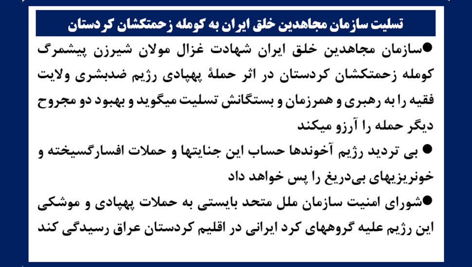- سازمان مجاهدین خلق ایران شهادت غزال مولان شیرزن پیشمرگ کومله زحمتکشان کردستان در اثر حملهٔ پهپادی رژیم ضدبشری ولایت فقیه را به رهبری و همرزمان و بستگانش تسلیت میگوید و بهبود دو مجروح دیگر حمله را آرزو میکند.