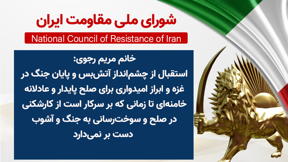 خانم مریم رجوی رئیس‌جمهور برگزیده مقاومت ایران از چشم‌انداز آتش‌بس و پایان خون‌ریزی و جنگ در غزه در رابطه با طرح رئیس‌جمهور آمریکا استقبال نمود و ابراز امیدواری کرد صلح پایدار و عادلانه در منطقه هر چه سریع‌تر برقرار شود. البته تردیدی نیست که خامنه‌ای و دیکتاتوری دینی حاکم بر ایران تا زمانی که بر سرکار است از کارشکنی در صلح و سوخت رسانی به جنگ و آشوب دست بر نمی‌دارد.