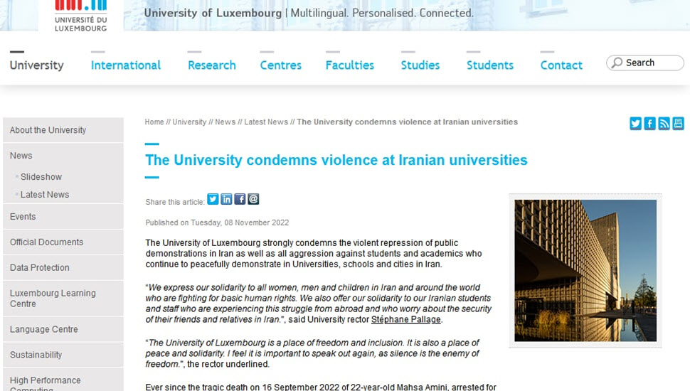سایت دانشگاه لوکزامبورگ سهشنبه ۱۷ آبان نوشت، دانشگاه لوکزامبورگ قویاً سرکوب خشونتبار تظاهرات سراسری در ایران و همچنین تمامی اعمال فشار خشونتبار علیه دانشجویان و دانشگاهیان را که در دانشگاهها و مدارس و شهرها در ایران که بهصورت صلحآمیز تظاهرات میکنند، محکوم میکند.