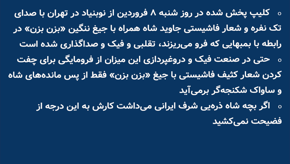 - کلیپ پخش شده در روز شنبه ۸ فروردین از نوبنیاد در تهران با صدای تک نفره و شعار فاشیستی جاوید شاه همراه با جیغ ننگین «بزن بزن» در رابطه با بمبهایی که فرو میریزند، تقلبی و فیک و صداگذاری شده است