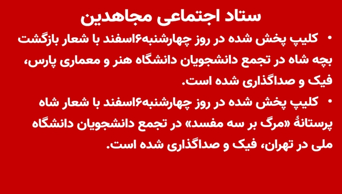 - کلیپ پخش شده در روز چهارشنبه۶اسفند با شعار شاه پرستانهٔ «مرگ بر سه مفسد» در تجمع دانشجویان دانشگاه ملی در تهران، فیک و صداگذاری شده است