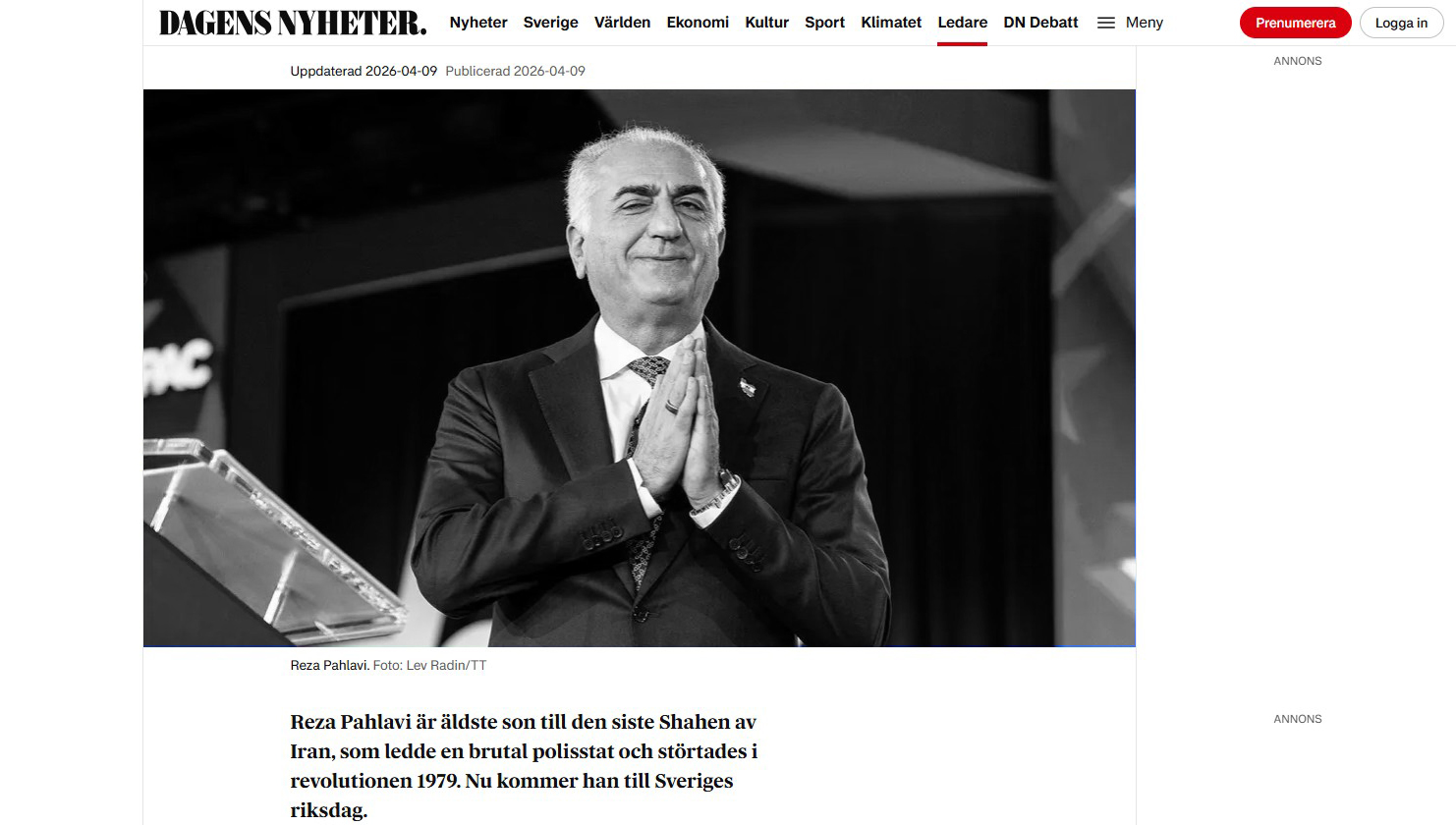 روزنامه سوئدی داگنز نیهیتر که در این کشور «رسانه مرجع» محسوب میشود و روزانه یک و نیم تا دو میلیون تیراژ آنلاین دارد، در سرمقاله شنبه ۱۱ آوریل (۲۲ فروردین ۱۴۰۵) دعوت بچه شاه به پارلمان سوئد توسط رهبر حزب راست افراطی به نام ابابوش را زیر علامت سؤال برده است. در این سرمقاله از جمله آمده است