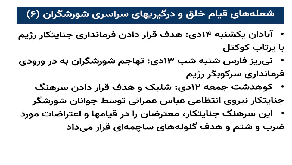 - کوهدشت جمعه ۱۲دی: شلیک و هدف قرار دادن سرهنگ جنایتکار نیروی انتظامی عباس عمرائی توسط جوانان شورشگر