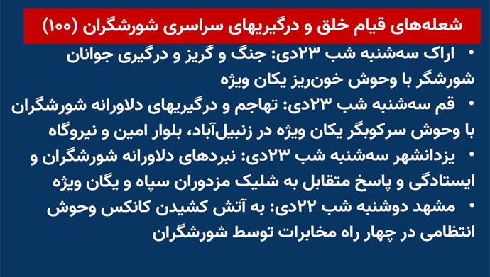 - قم سهشنبهشب ۲۳دی: تهاجم و درگیریهای دلاورانه شورشگران با وحوش سرکوبگر یگان ویژه در زنبیلآباد، بلوار امین و نیروگاه