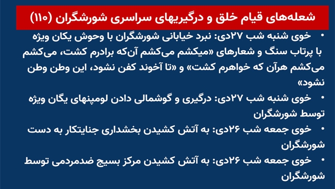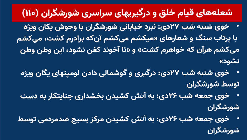 - خوی شنبه شب ۲۷دی: نبرد خیابانی شورشگران با وحوش یکان ویژه با پرتاب سنگ و شعارهای «میکشم میکشم آنکه برادرم کشت، میکشم میکشم هرآن که خواهرم کشت» و «تا آخوند کفن نشود، این وطن وطن نشود»