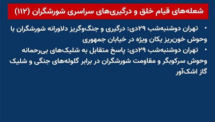 - تهران دوشنبهشب ۲۹دی: پاسخ متقابل به شلیکهای بیرحمانه وحوش سرکوبگر و مقاومت شورشگران در برابر گلولههای جنگی و شلیک گاز اشکآور