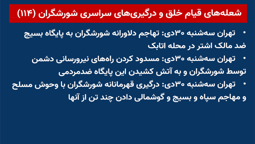 • تهران سه‌شنبه ۳۰دی: مسدود کردن راه‌های نیرورسانی دشمن توسط شورشگران و به آتش کشیدن این پایگاه ضدمردمی