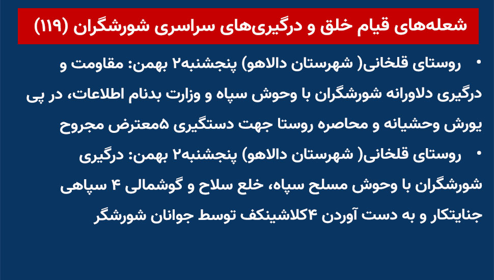- روستای قلخانی (شهرستان دالاهو) پنجشنبه ۲ بهمن: مقاومت و درگیری دلاورانه شورشگران با وحوش سپاه و وزارت بدنام اطلاعات، در پی یورش وحشیانه و محاصره روستا جهت دستگیری ۵معترض مجروح