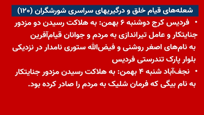 - فردیس کرج دوشنبه ۶بهمن: به هلاکت رسیدن ۲مزدور جنایتکار و عامل تیراندازی به مردم و جوانان قیامآفرین به نامهای اصغر روشنی و فیضالله ستوری نامدار در نزدیکی بلوار پارک تندرستی فردیس