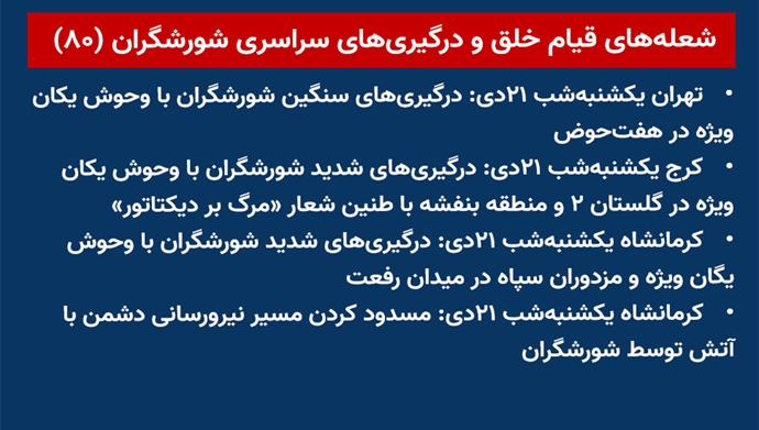 - کرمانشاه یکشنبهشب ۲۱دی: مسدود کردن مسیر نیرورسانی دشمن با آتش توسط شورشگران