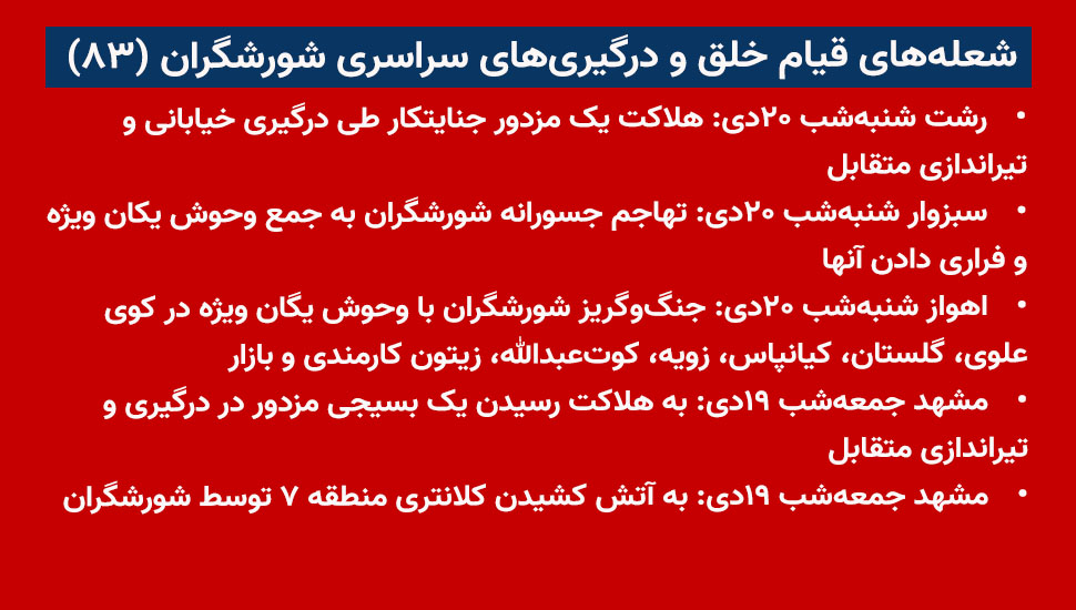 • اهواز شنبه‌شب ۱۹دی: جنگ‌وگریز شورشگران با وحوش یگان ویژه در کوی علوی، گلستان، کیانپاس، زویه، کوت‌عبدالله، زیتون ‌کارمندی و بازار