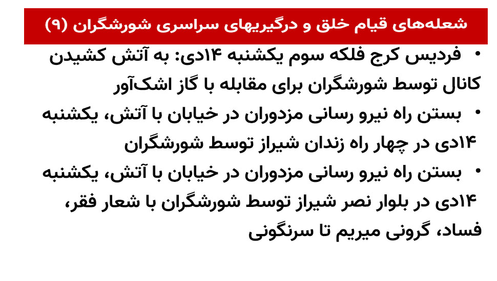 - بستن راه نیرورسانی مزدوران در خیابان با آتش، یکشنبه ۱۴دی در بلوار نصر شیراز توسط شورشگران با شعار فقر، فساد، گرونی میریم تا سرنگونی