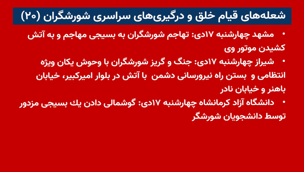 • شیراز چهارشنبه ۱۷دی: جنگ و گریز شورشگران با وحوش یکان ویژه انتظامی و بستن راه نیرورسانی دشمن با آتش در بلوار امیرکبیر، خیابان باهنر و خیابان نادر