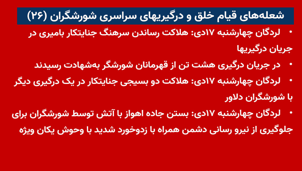 لردگان چهارشنبه ۱۷ دی: بستن جاده اهواز با آتش توسط شورشگران برای جلوگیری از نیرو رسانی دشمن همراه با زدوخورد شدید با وحوش یکان ویژه
