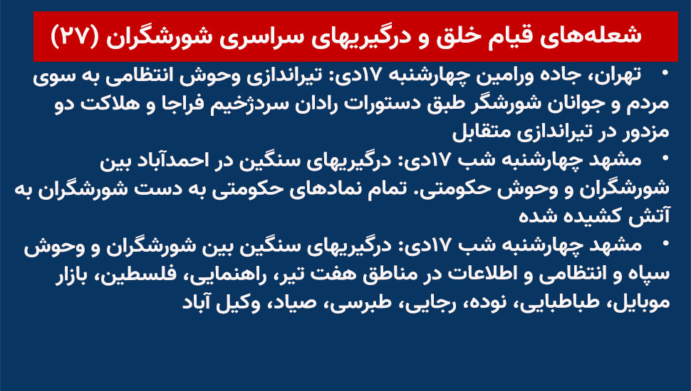 - مشهد چهارشنبه شب ۱۷ دی: درگیریهای سنگین بین شورشگران و وحوش سپاه و انتظامی و اطلاعات در مناطق هفت تیر، راهنمایی، فلسطین، بازار موبایل، طباطبایی، نوده، رجایی، طبرسی، صیاد، وکیل آباد