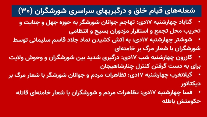 - شوشتر چهارشنبه ۱۷ دی: به آتش کشیدن نماد جلاد قاسم سلیمانی توسط شورشگران با شعار مرگ بر خامنهای
