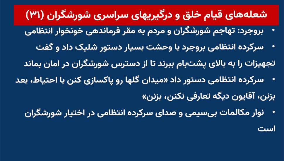 - سرکرده انتظامی بروجرد با وحشت بسیار دستور شلیک داد و گفت تجهیزات را به بالای پشتبام ببرند تا از دسترس شورشگران در امان بماند
