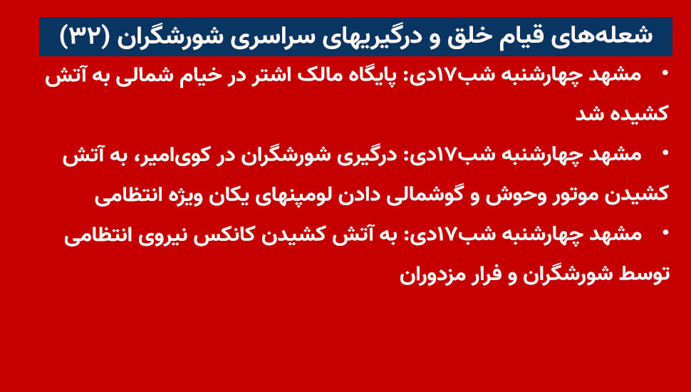 - مشهد چهارشنبه شب۱۷ دی: پایگاه مالک اشتر در خیام شمالی به آتش کشیده شد