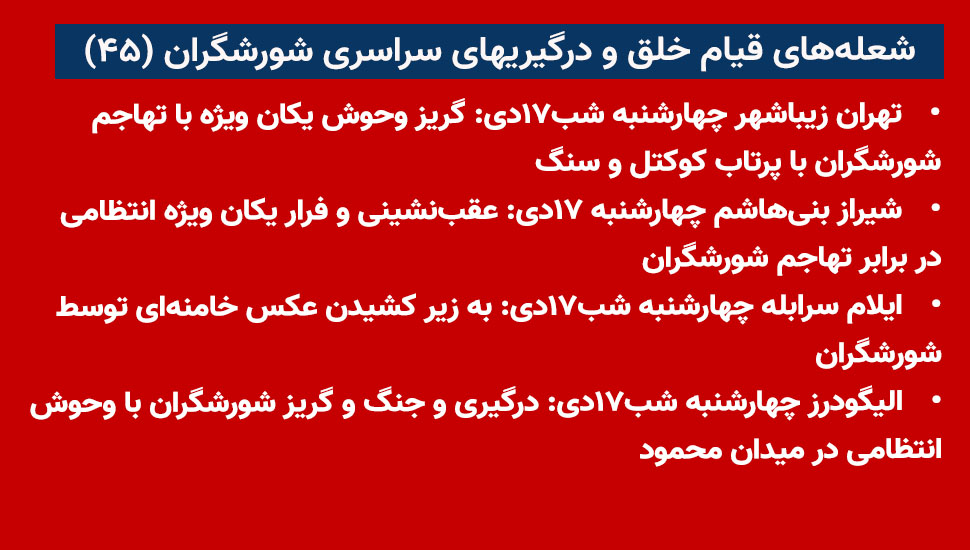 - شیراز بنیهاشم چهارشنبه ۱۷دی: عقبنشینی و فرار یکان ویژه انتظامی در برابر تهاجم شورشگران