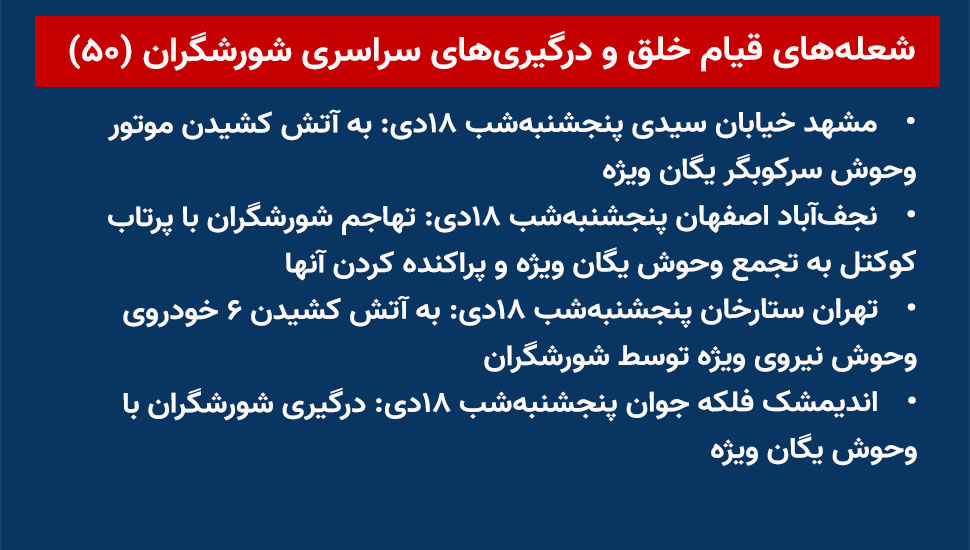 - نجفآباد اصفهان پنجشنبهشب ۱۸دی: تهاجم شورشگران با پرتاب کوکتل به تجمع وحوش یگان ویژه و پراکنده کردن آنها
