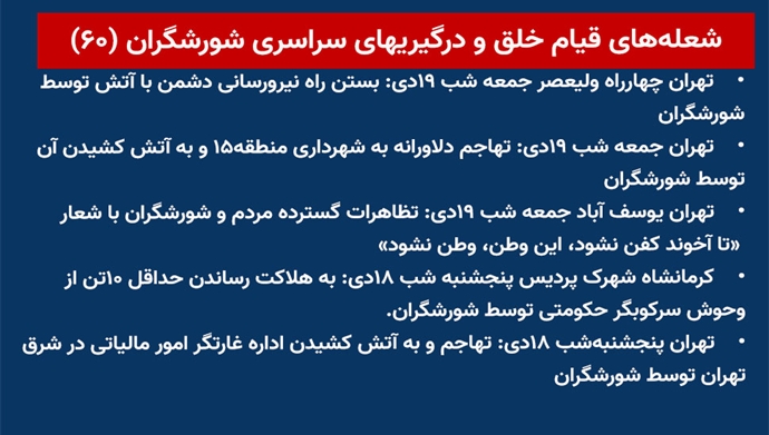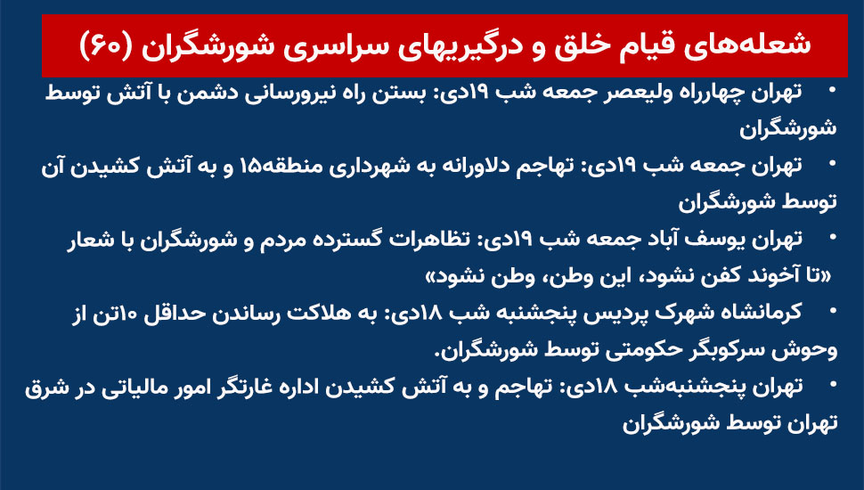 - تهران جمعهشب ۱۹دی: تهاجم دلاورانه به شهرداری منطقه ۱۵ و به آتش کشیدن آن توسط شورشگران