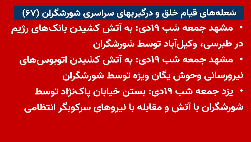 - یزد جمعه شب ۱۹دی: بستن خیابان پاکنژاد توسط شورشگران با آتش و مقابله با نیروهای سرکوبگر انتظامی