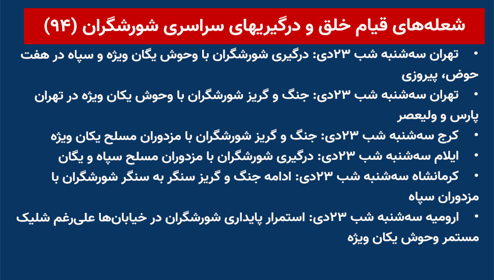 - ایلام سهشنبهشب ۲۳دی: درگیری شورشگران با مزدوران مسلح سپاه و یکان ویژه