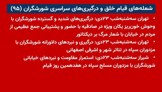 - تهران سهشنبهشب ۲۳دی: درگیریهای شدید و گسترده شورشگران با وحوش خونریز یکان ویژه در صادقیه با حضور و پشتیبانی جمع عظیمی از مردم در خیابان با شعار مرگ بر دیکتاتور