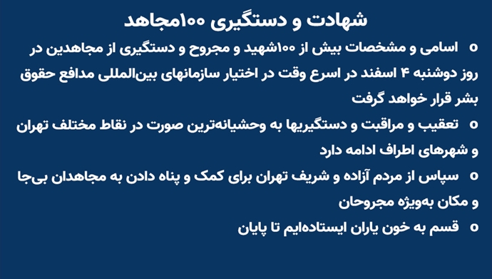 - اسامی و مشخصات بیش از ۱۰۰شهید و مجروح و دستگیری از مجاهدین در روز دوشنبه ۴ اسفند در اسرع وقت در اختیار سازمانهای بینالمللی مدافع حقوقبشر قرار خواهد گرفت