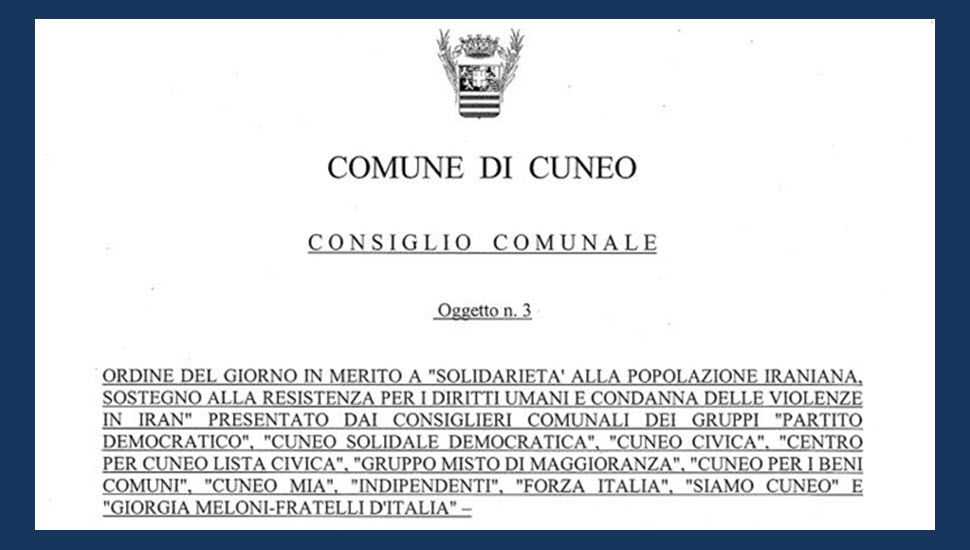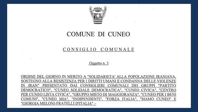 بر این اساس، شورای شهر کونئو به‌طور رسمی همبستگی خود را با مردم ایران در قیام برای آزادی اعلام کرده و هر گونه خشونت، سرکوب، اعدام و بازداشت خودسرانه را قاطعانه محکوم می‌کند و خواستار آزادی فوری تمامی بازداشت شدگان می‌شود. این شورا حمایت خود را از خیزش مردم ایران برای دستیابی به آزادی، عدالت و یک نظام دموکراتیک اعلام می‌کند و از دولتها و نهادهای اروپایی می‌خواهد اقدامات مؤثر و قاطع برای توقف سرکوب در ایران اتخاذ کنند.