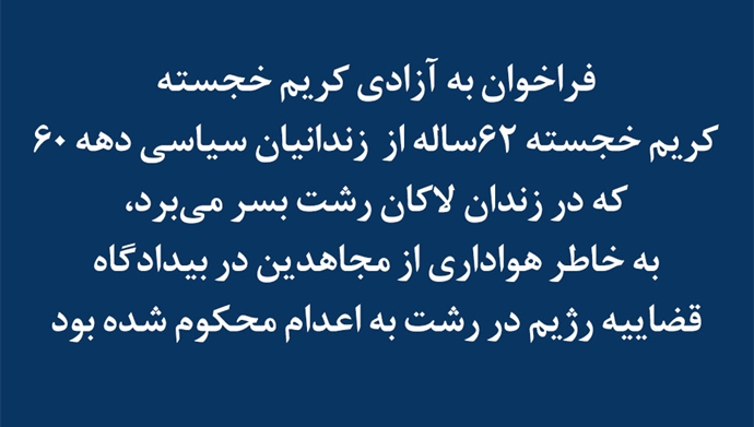 - کریم خجسته ۶۲ساله از زندانیان سیاسی دهه ۶۰، مهندس تولید دستگاههای صنعتی، اهل شهرستان انزلی که در زندان لاکان رشت بهسر میبرد، بهخاطر هواداری از مجاهدین در بیدادگاه قضاییه رژیم در رشت به اعدام محکوم شده بود