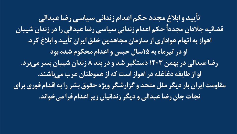 قضاییه جلادان مجدداً حکم اعدام زندانی سیاسی رضا عبدالی را در زندان شیبان اهواز به اتهام هواداری از سازمان مجاهدین خلق ایران تأیید و ابلاغ کرد