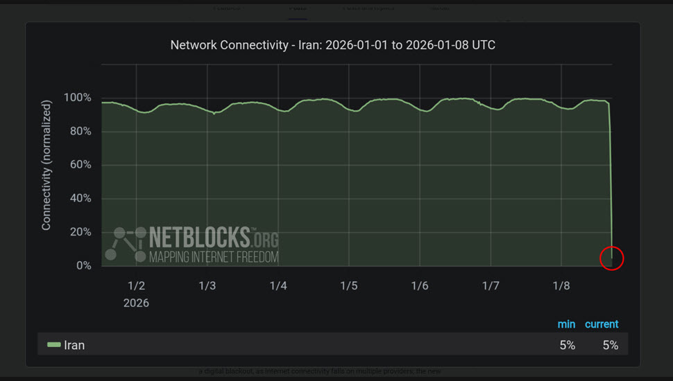 «نت بلاکس» که محدودیت دسترسی به اینترنت در جهان را رصد میکند، اعلام کرد که بر اساس دادهها، ایران وارد یک قطعی سراسری اینترنت شده است. این وضعیت پس از تشدید سانسور دیجیتال در ارتباط با اعتراضات رخ داده و در این مقطع حساس، حق ارتباط و اطلاعرسانی مردم را مختل خواهد کرد.