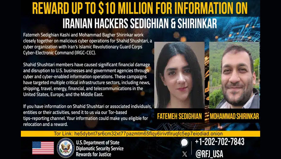 وزارتخارجه ایالات متحده در چارچوب برنامه «پاداش برای عدالت»(Rewards for Justice) اعلام کرد که تا سقف ۱۰میلیون دلار برای ارائه اطلاعاتی که منجر به شناسایی یا مکانیابی ۲تن از مأموران رژیم ایران متهم به حملات سایبری علیه زیرساختهای حیاتی آمریکا شود، جایزه پرداخت میکند.
