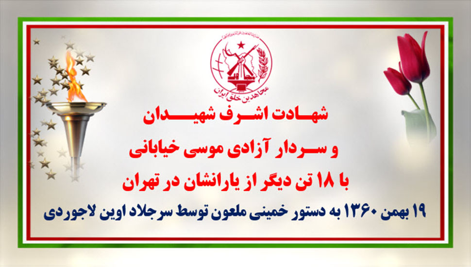 - شهـادت اشرف شهیدان و سردار آزادی موسی خیابانی با ۱۸تن دیگر از یارانشان در تهران در ۱۹بهمن ۱۳۶۰ بهدستور خمینی ملعون توسط سرجلاد اوین لاجوردی