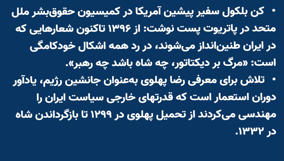 - کن بلکول سفیر پیشین آمریکا در کمیسیون حقوقبشر ملل متحد در پاتریوت پست نوشت: از ۱۳۹۶ تاکنون شعارهایی که در ایران طنینانداز میشوند، در رد همه اشکال خودکامگی است: «مرگ بر دیکتاتور، چه شاه باشد چه رهبر».