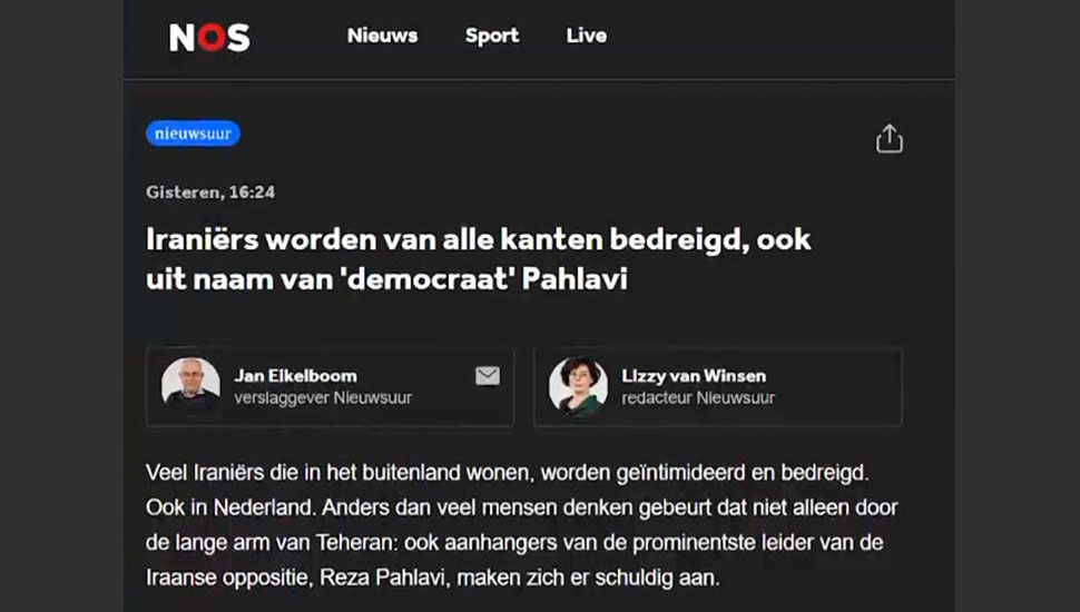 بسیاری از ایرانیهایی که در خارج از کشور زندگی میکنند، مورد تهدید و ارعاب قرار میگیرند. این اتفاق در هلند هم رخ میدهد. برخلاف آنچه بسیاری تصور میکنند، این تهدیدها فقط از سوی «بازوی بلند تهران» نیست؛ هواداران رضا پهلوی نیز در این کار دخیلاند. پهلوی طرفدار حمله آمریکا و اسراییل به ایران است.