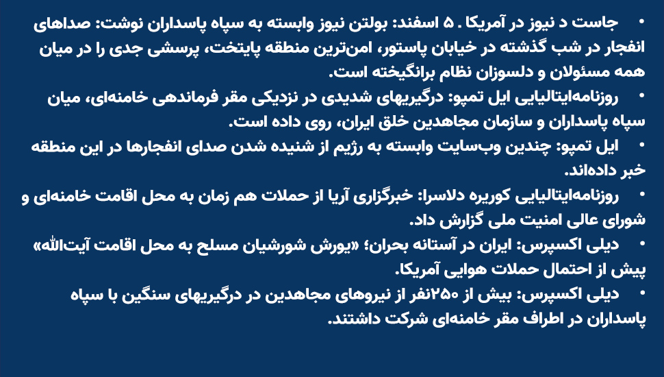 - روزنامهایتالیایی کوریره دلاسرا: در تهران در نزدیکی مقر فرماندهی خامنهای، میان نیروهای سپاه پاسداران و سازمان مجاهدین خلق ایران درگیریهای شدیدی رخ داد. خبرگزاری آریا از حملات هم زمان به محل اقامت خامنهای و شورای عالی امنیت ملی گزارش داد.