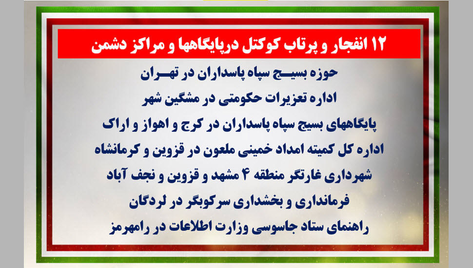 - تهاجم به پایگاه بسیج سپاه پاسداران در کرج با پرتاب کوکتل