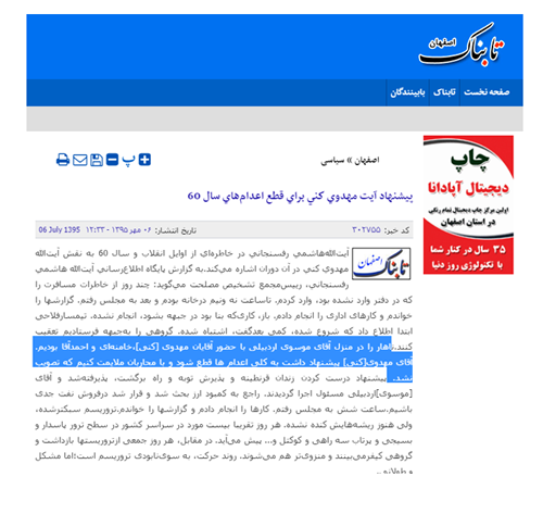 از خاطرات رفسنجانی: ”ناهار را در منزل‌ آقای موسوی اردبیلی با حضور آقایان‌ مهدوی [کنی] ، خامنه‌ای و احمدآقا بودیم‌. آقای مهدوی [کنی] پیشنهاد داشت‌ به‌ کلی اعدامها قطع‌ شود و با محاربان‌ ملایمت کنیم‌ که‌ تصویب‌ نشد“. (سایت تابناک 6مهر 95)