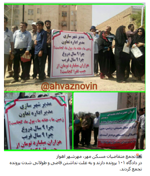 در اهواز نیز شماری از غارت شدگان مسکن مهر که بیش از 9سال است پول خود را پرداختهاند و هر بار هم به بهانهیی کارگزاران رژیم جیب آنها را خالی میکنند ولی از خانه خبری نیست دست به تجمع اعتراضی زدند، بر روی پلاکاردها نوشتهاند: زمین ما، خانه ما، پول ما کجاست؟ و هزاران میلیارد تومان پول فقرا کجاست.