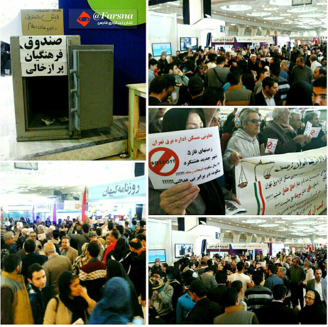 این هموطنان که دهها میلیون تومان سپردههایشان توسط باندهای وابسته به بیت خامنهای و امام جمعههای رژیم در خراسان غارت شده، در نمایشگاه مطبوعات به افشاگری پرداختند. یکی از مالباختگان غارت شده گفت: ”آقای رشیدیان استاندار خراسان این جا بود گفت من هنوز پیگیرم نتوانستم جواب بگیرم و گفت تأمین اجتماعی بدهکار است، بورس شهرداری بدهکار است جهاد بدهکار است! پس این 5سال اینها کجا بودند. من 24سالم است و میخواهم بروم و کلیهام را بفروشم. ندارم! بخدا از این وضعیت بریدم! چهکار کنم؟“ این هموطن خطاب به کارگزاران رژیم گفت: شما چه جور سرتان را روی روی بالش میگذارید. من دیگر نمیتوانم به دین اعتقاد پیدا کنم. خسته شدم. مگر شما مسلمان نیستید؟ مگر خودتان بچه ندارید. دو سال است که شبها تا به صبح کابوس میبینم“.
