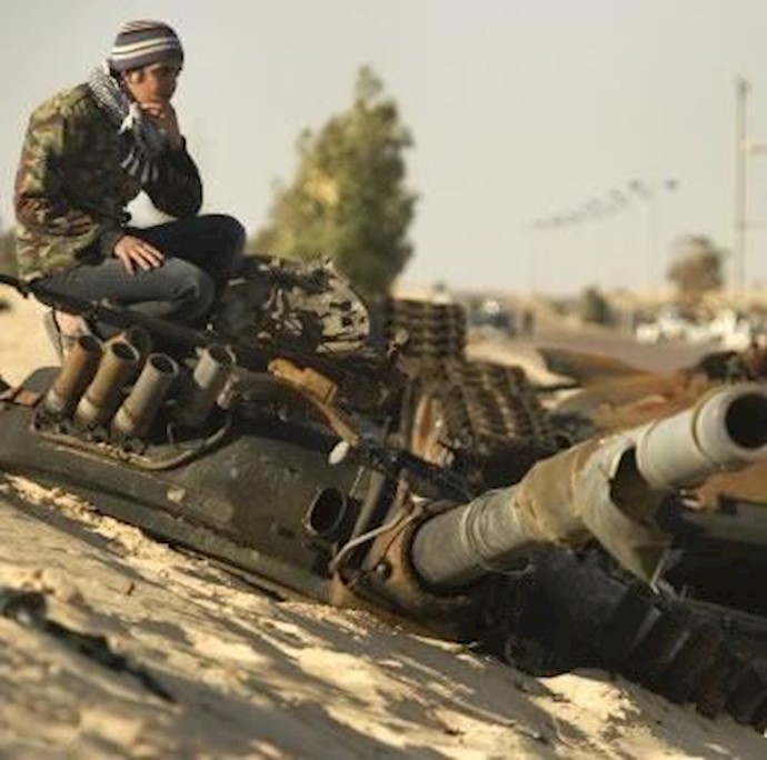 یکی از انقلابیون لیبی بر روی تانکی که در خارج اجدابیا توسط نیروهای ناتو منهدم شده، نشسته است